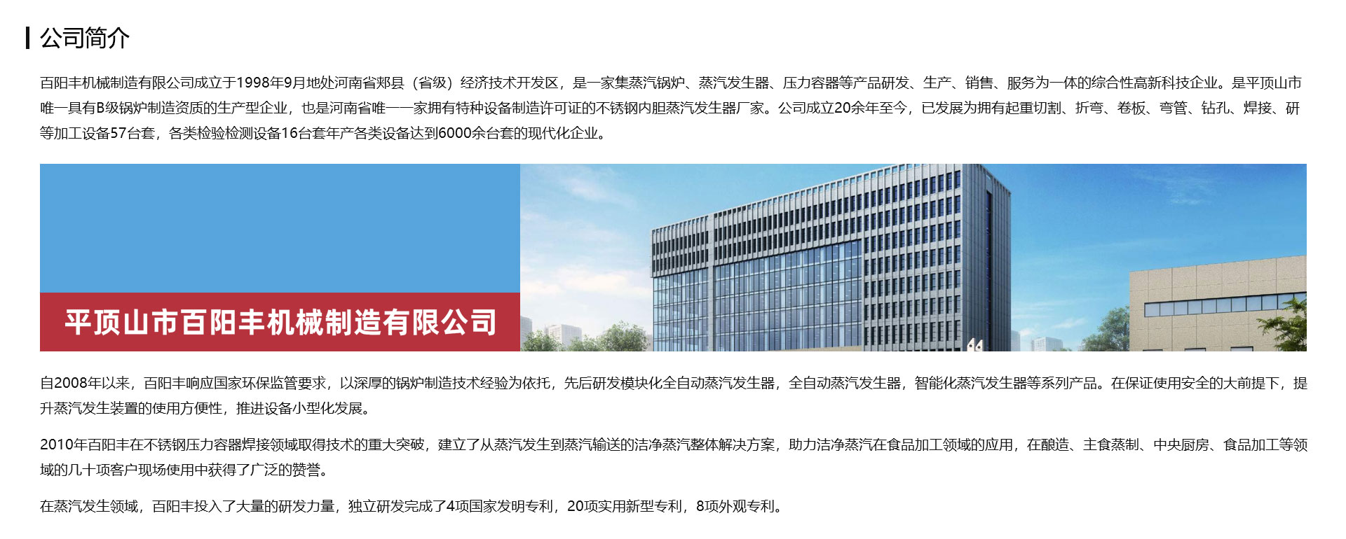 百陽豐機(jī)械制造有限公司成立于1998年9月地處河南省郟縣(省級)經(jīng)濟(jì)技術(shù)開發(fā)區(qū),是一家集蒸汽鍋爐、蒸汽發(fā)生器、壓力容器等產(chǎn)品研發(fā)、生產(chǎn)、銷售、服務(wù)為一體的綜合性高新科技企業(yè)。是平頂山市一家具有B級鍋爐制造資質(zhì)的生產(chǎn)型企業(yè),也是一家擁有特種設(shè)備制造許可證的不銹鋼內(nèi)膽蒸汽發(fā)生器廠家。公司成立20余年至今,已發(fā)展為擁有起重切割、折彎、卷板、彎管、鉆孔、焊接、研等加工設(shè)備57臺套,各類檢驗檢測設(shè)備16臺套年產(chǎn)各類設(shè)備達(dá)到6000余臺套的現(xiàn)代化企業(yè)。